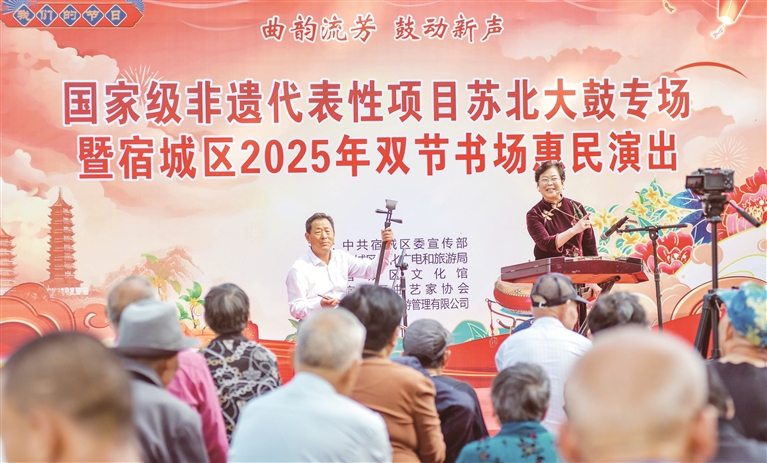 9月30日下午,由中共宿城区委宣传部、宿城区文化广电和旅游局主办的“曲韵流芳 鼓动新声”国家级非遗代表性项目苏北大鼓专场暨宿城区2025年双节书场惠民演出,在宿城区印象黄河景区双塔公园内举行。本次演出特邀苏北大鼓、苏北琴书区级以上非遗传承人登台,吸引了大批市民前来观看,感受传统曲艺的独特魅力。
