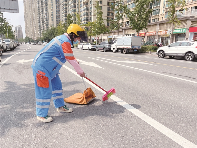 这是薛蓓月从事环卫工作的第5年。“我的工作看着简单,要做的事却不少。每天早上到岗后,我先把负责区域的主次干道扫一遍,不能漏下卫生死角,然后要检查绿化带,捡拾草丛里的纸屑、塑料袋等。此外,还要把沿途的垃圾桶擦干净。”薛蓓月说。
