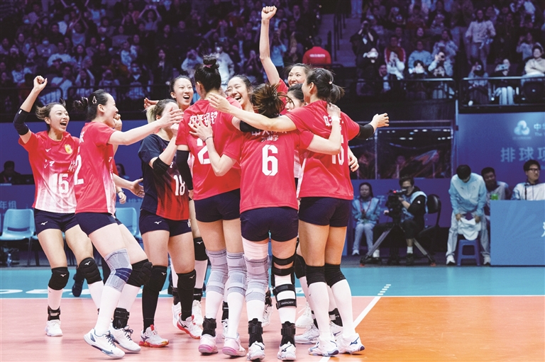 11月19日,第十五届全国运动会排球女子成年组冠亚军决赛中,江苏队球员庆祝胜利。 新华社发 张金加 摄