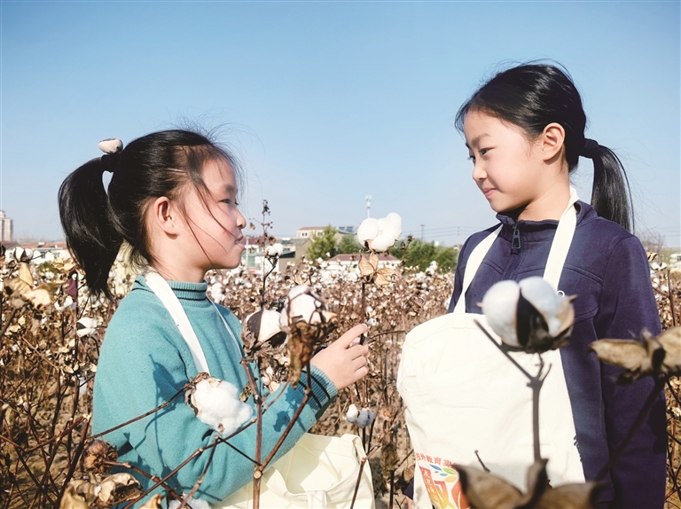 学生与家长手持提前备好的布袋,穿梭在白茫茫的棉田间,开启采摘之旅。孩子们踮起脚尖、伸手采摘,家长们在一旁协助指导。不一会儿,一个个布袋便装满了雪白的棉花,这片棉田俨然成为亲子互动、共享欢乐的“开心农场”。 本报记者 秦海 通讯员 王朝辉 摄