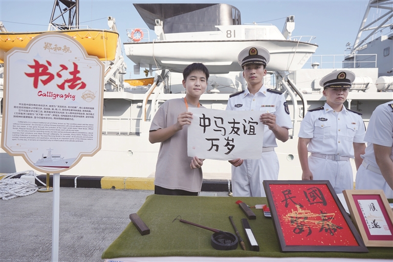 12月1日,在马来西亚巴生港,参观者在中国海军989编队组织的舰艇开放活动上展示书法。