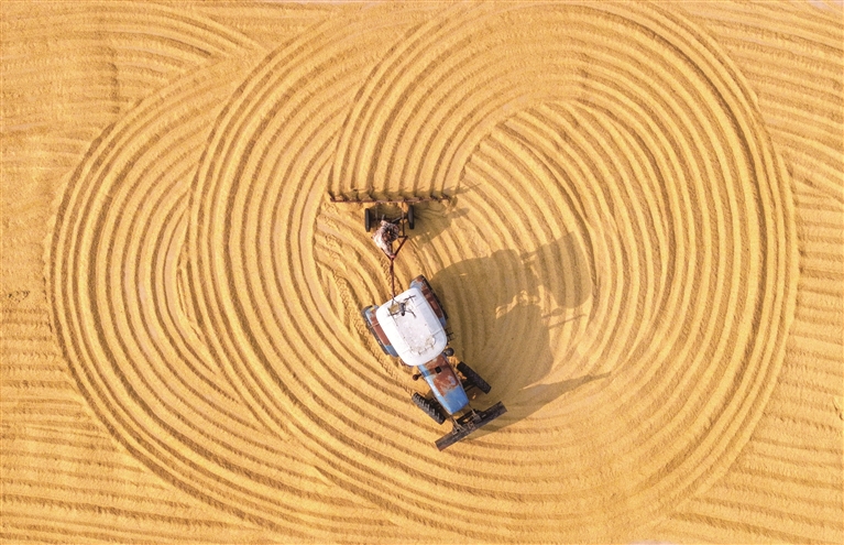 10月26日,江苏省洪泽湖农场的农户抢抓晴好天气晾晒稻谷。