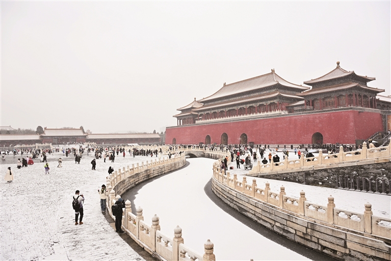 12月12日,游客在北京故宫赏雪。当日,北京迎来今冬首场明显降雪。新华社记者 李鑫 摄